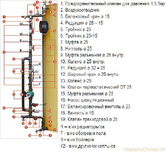 1. Отдушник, 2. Редукция ø 25 - 1, 3. Редукция ø 32 - 25, 4. Зърно ø 25, 5. Тройник ø 25, 6. Връзка ø 25, 7. Коляно ø 25 вътрешно, 8. Зърно ø 15, 9. Налягане на предпазния клапан 1,5 бара, 10. Сферичен кран с гайка ø 25 вътреш., 11. Сферичен кран с гайка ø 25 вътреш., 12. Гайка връзка на циркулационната помпа ø 25, 13. Циркулационна помпа, 14 Сферичен кран ø 15 женски, 15. Трипосочен насочен клапан ø 25, 16. Свързване на гайка на клапана ø 25, 17. Коляно ø 15 женско / мъжко, 18. Коляно ø 25 женско / мъжко, 19. Филтър ø 25, 20. Балансиращ клапан ø 25, 21. Редукция ø 25 –20, 22. Разширителен резервоар, 23. Щепсел ø 25 навън., 24. Кръст ø 25, 25. Тройник ø 25 - 15, 26. Трипътен смесителен клапан ø 25, 27. Балансиращ клапан ø 15, R - към / от радиатори / s, B - към / от котел / и, F - към / от подово отопление / s, H - към / от сушилня / и с термостатични клапани