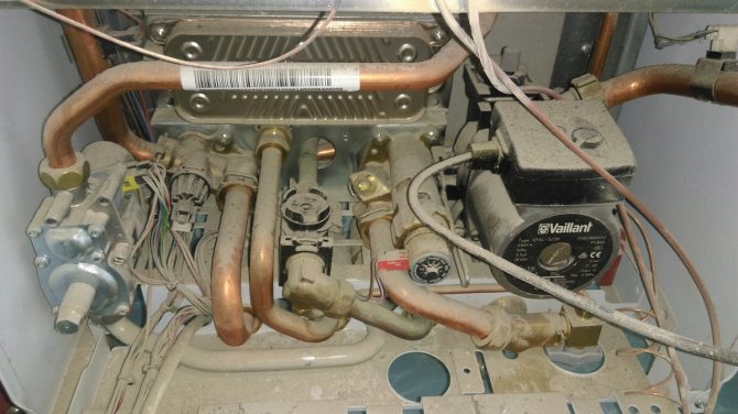 Поради факта, че водата не се филтрира, преди да влезе в нагревателните елементи (прочетете за избора на филтър за отопление в отделен материал), следователно утайката често остава върху вътрешните повърхности на газовия котел. Частите постепенно губят своята функционалност. Проблемите започват с елементите за пренос на топлина. Освен това се образува утайка по стените на радиаторите, тръбите, това намалява пространството, през което трябва да тече вода. Доста просто е да се отървете от котлен камък, просто отворете газовия котел и го почистете със специални средства. В този случай страда само устойчивостта на износване на самото оборудване. За да се избегнат подобни проблеми в бъдеще, достатъчно е да се извършва периодично превантивно почистване.