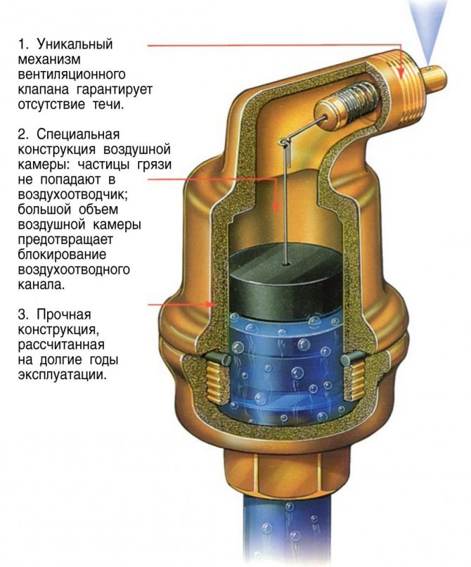 Въздушен клапан (или няколко) е инсталиран в отоплителната система, на места, най-вероятни за натрупване на въздушни мехурчета. Това предотвратява образуването на големи задръствания, отоплението работи безпроблемно.