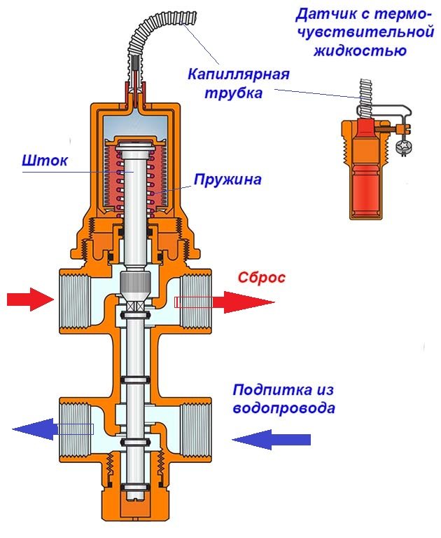 - към изходната тръба на клапана е прикрепена дренажна тръба, която отклонява излишната охлаждаща течност към връщащата тръба или към канализацията;