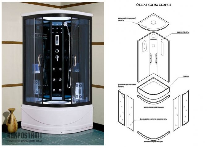 По правило монтажната схема на душ кабината се доставя със самия продукт. Ако нямате късмет и няма инструкции заедно с детайлите или обикновено сглобявате душ от самостоятелно избрани елементи, няма значение. Самият процес на редактиране обикновено е интуитивен и по-долу ще разгледаме основните му аспекти.