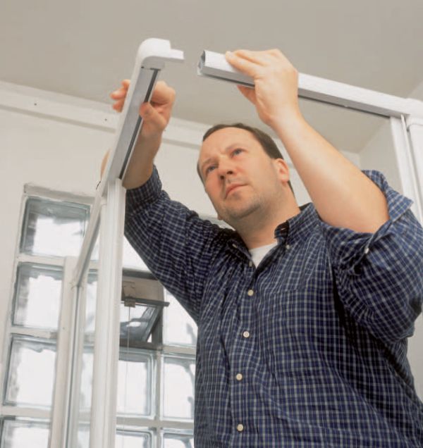 Сега можете да започнете да инсталирате вратите на кабината. Всъщност това всъщност не е инсталация, а само общ монтаж. Рамката с подвижни стъклени врати се вкарва в закрепващия профил, но не е напълно фиксирана. Все пак ще трябва да бъде изложено: както равнината на стъклото, така и ръбът му трябва да бъдат строго вертикални. След това е необходимо да се свържат отделните части на горния профил. Това се прави във всички модели по почти един и същ начин: части от профила са свързани чрез специални ъглови пластмасови или метални вложки. Тъй като долният и горният профил имат плъзгащи се релси за монтиране на врати в тях, след това, като ги плъзнете навътре или навън, можете да изберете общата дължина на цялата стена на кабината в съответствие с дължината на страните на палета.