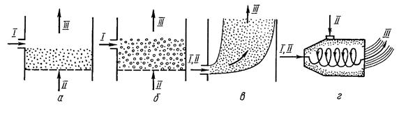 а - слоест; b - с кипящ слой; в - факел; r - вихър; Ι - гориво; ΙΙ - въздух; ΙΙΙ - димни газове