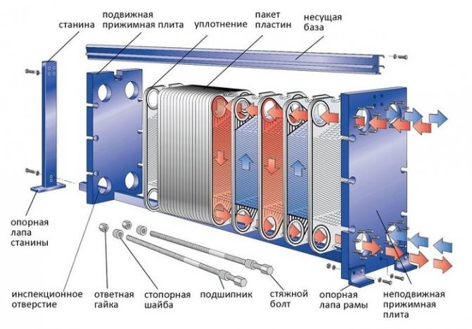 Конструкцията и принципът на работа на пластинчатия топлообменник ще зависят от модификацията на оборудването, което може да съдържа различен брой плочи с неподвижни уплътнения. Тези уплътнения покриват каналите с течащия термичен носител. За да се постигне необходимата плътност на сцеплението на двойки взаимно свързани уплътнения, е достатъчно тези плочи да се фиксират с подвижна плоча.