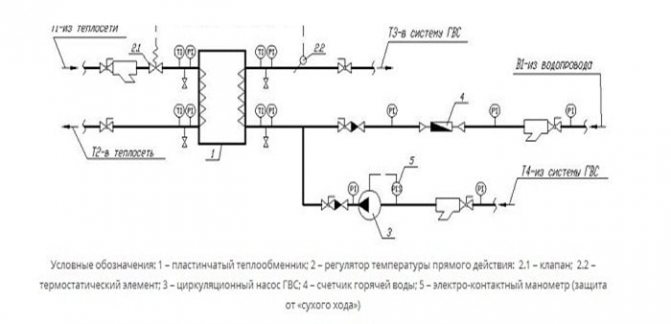 1 - плоча топлообменник; 2 - регулатор на температурата; 2.1 - клапан; 2.2 - термостат; 3 - циркулационна помпа; 4 - измервателен уред за консумация на топла вода; 5 - манометър.