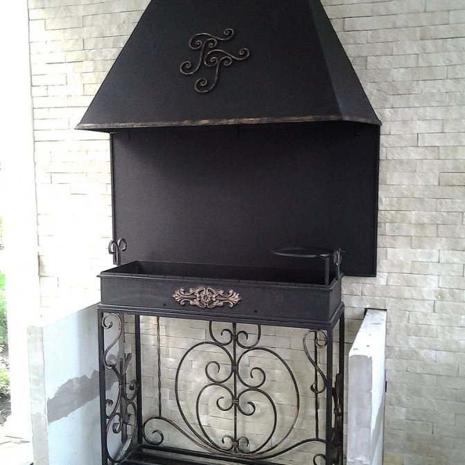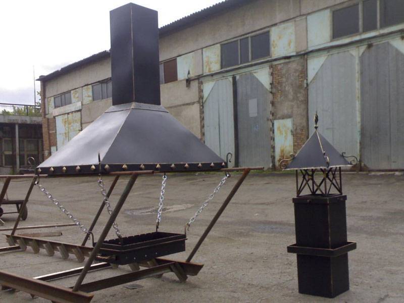 При липса на заваръчна машина конструктивните елементи могат да бъдат закрепени с болтове. Металната качулка не създава сериозно натоварване върху основата на беседката, стените й имат гладка повърхност, върху която, за разлика от тухлената зидария, замърсяването на сажди не се придържа.Ако имате нужда от сезонна употреба или прехвърляне на друго място, конструкцията лесно се разглобява. Може да се боядисва във всеки цвят с топлоустойчива боя.