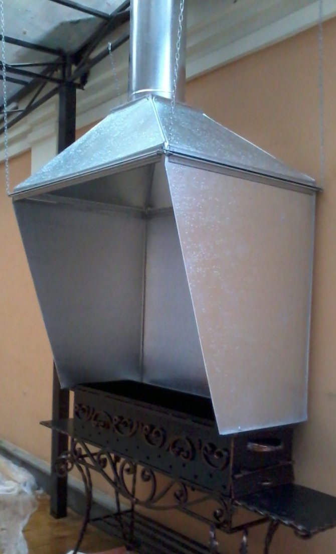 У дома, за да направите такава качулка със собствените си ръце, имате нужда от заваръчна машина. Най-лесният начин да направите трапецовиден чадър. За това се изрязват 4 еднакви трапецовидни части. Те са заварени един към друг с странични повърхности, след което горният, по-тесен отвор се затваря с изрязан квадратен елемент, в който в центъра се прави отвор за комин. Самата тръба се купува готова, тя се заварява към изпускателния отвор, след което долната част на купола се укрепва чрез заваряване на тънка армировка по периметъра. Размерът на трапецовидните части, които ще се режат, зависи от параметрите на екструдиране.В този случай дължината на основата на трапеца трябва да бъде такава, че да осигурява потока дим от барбекюто. Монтажът се извършва строго над мангала.