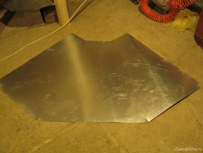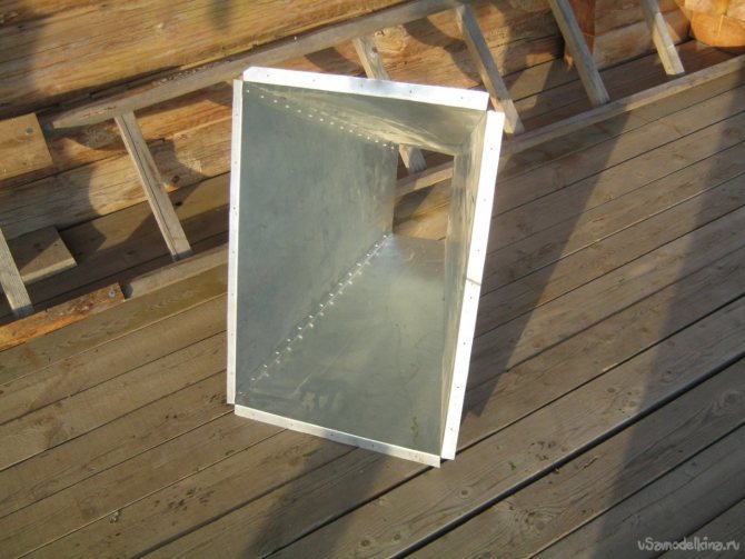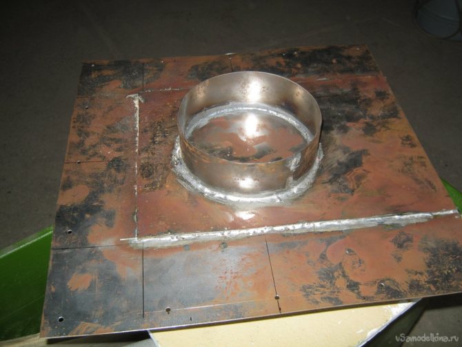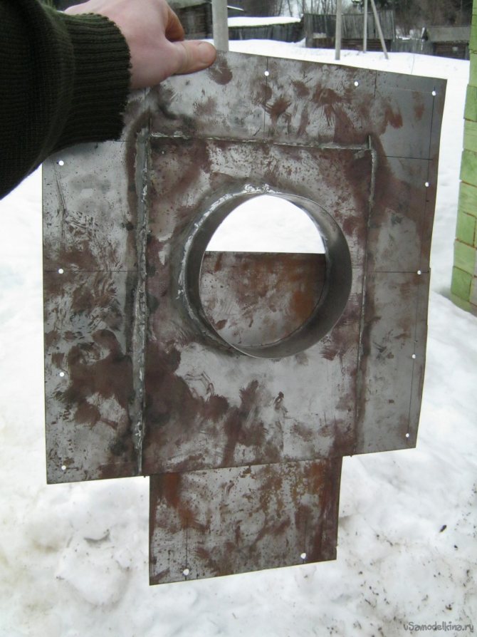 След маркирането бяха изрязани три основни плоски части, на основата беше изрязан квадратен отвор с размер 150x150 mm (за въздуховод ø150 mm). Покритие е запоено върху основата на портата. Покритието се поставя върху парчета от поцинкована стоманена тел с диаметър 2 mm, преди това се полага поток върху мястото за запояване.