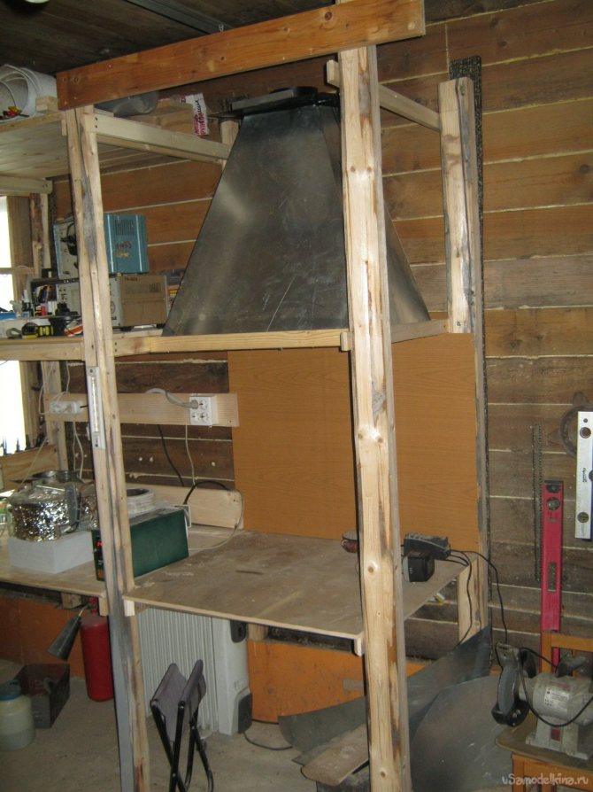 По-долу е описано производството на аспиратор за аспиратор за работно място на стъклодувачка в домашна работилница. Качулката е изработена от прости и често срещани материали без използването на специално оборудване за калайджийство. Описаният чадър има формата на наклонена тетраедрична пирамида (по-добро използване на пространството), размах за такава форма може да бъде изграден с помощта на описателна геометрия (по няколко начина). За по-проста форма - права пирамида, разгъването може да бъде изчислено и автоматизирано. Размерите на чадъра са взети умишлено с прекомерен запас, ако е необходимо, всички необходими изчисления на вентилационното оборудване могат да бъдат намерени в литературата. Аспираторът е вграден в стелажите и е оборудван с вграден самоделен амортисьор, който изключва въздуховода.