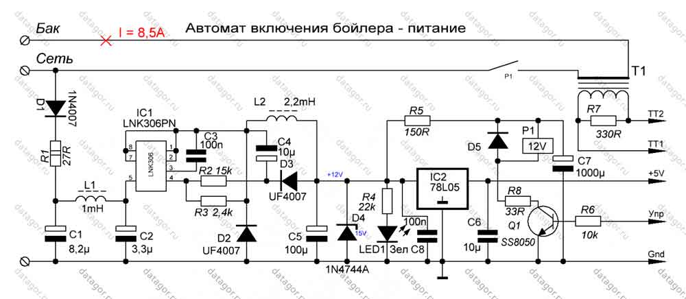 Диапазонът на мощността, в който котелът работи, е 2,5-3,5 kW, следователно, за да се предотврати прегряване на мрежата, се отделя отделна линия (3-жилен кабел 2,5-3 mm). За устройства с висока мощност се препоръчва да се използва директна връзка вместо обичайния контакт от контакта. Схематично изглежда така: