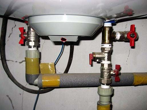 Свързването на бойлера с водопроводната тръба се осъществява през долния разклонителен тръбопровод, а маркучът е свързан към изходящия разклонителен тръбопровод за изход на вода. Предпазните клапани са монтирани на входа и изхода, те са отворени, ако бойлерът е включен, и затворени, ако устройството е изключено.
