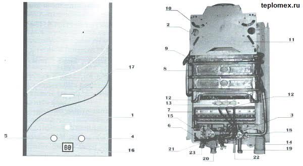 1 - корпус на дозатора 2 - рамка 3 - водно-газов блок 4 - регулатор на налягането на водата 5 - регулатор на температурата на водата 6 - соленоиден клапан 7 - газова горелка 8 - топлообменник 9 - сензор за защита от прегряване 10 - сензор за тяга 11 - GOU 12 - запалване електрод 13 - монитор на пламъка 14 - кутия за батерии 15 - блок за управление 16 - дисплей 17 - стъкло за наблюдение 18 - микропревключвател 19 - вход за студена вода 20 - вход за газ 21 - изход за топла вода 22 - предпазен клапан 23 - сензор за температура на водата на изхода