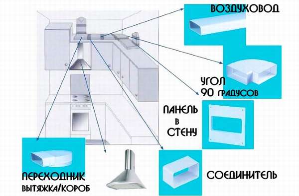 Домакинските уреди от тип ауспух се състоят от няколко функционални блока. Един от основните е въздуховодът, използван за отстраняване на замърсения въздух и сажди от зоната за готвене, яденето на храна. Говорим за специален канал (в някои случаи той прилича на тръба), през който въздухът се насочва от всмукателното устройство към изхода (шахта на вентилационния канал).