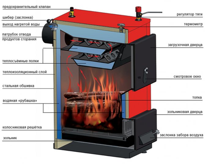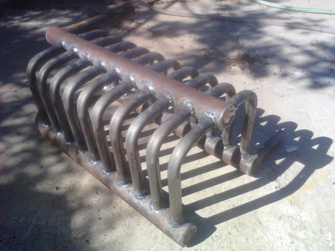 Диаграмата показва една от опциите на бобината. Добре е да поставите този вид топлообменник в печки за отопление и готвене, защото структурата му лесно ви позволява да поставите печка отгоре.
