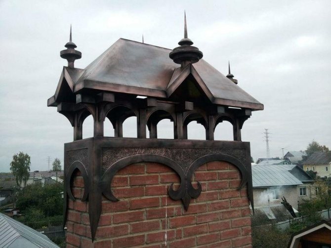 - подреждане на тухлен комин с чадър предотвратява разрушаването на материала, а наличието на специални канали позволява своевременно да се отстрани целият натрупващ се кондензат;