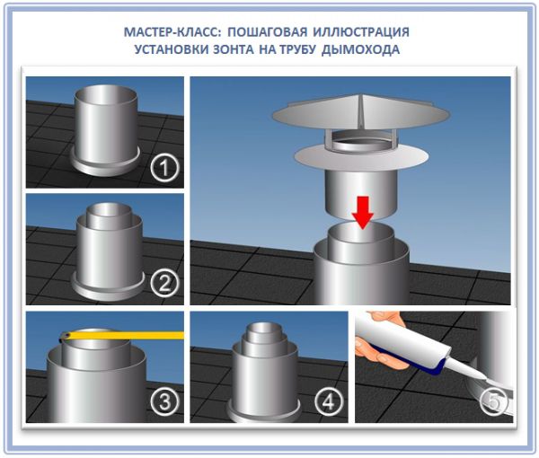 Когато инсталирате тръбен чадър, ще трябва да използвате крепежни елементи, те ще трябва да бъдат избрани въз основа на избрания дизайн на чадъра и дебелината на комина. Също така, когато избирате комин, не забравяйте за диаметъра на тръбата, те трябва да бъдат идентични.