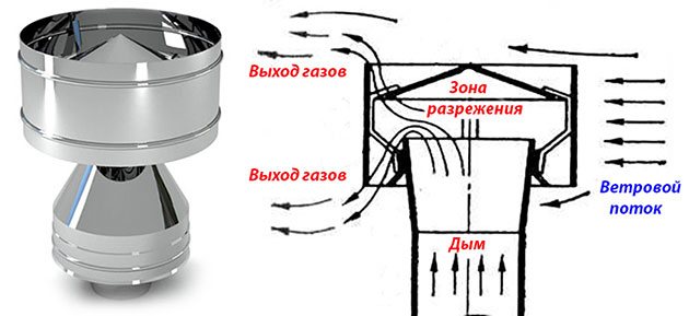 Това е специален вид чадър, който е инсталиран в горната част на комина. Основната му цел е да увеличи тягата в системата. Дефлекторът има високи аеродинамични свойства и работи съгласно закона на Бернули. Наличието на такъв чадър върху вентилационната система значително ще увеличи ефективността на сцеплението.