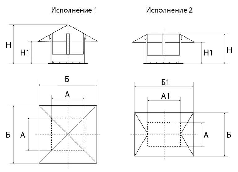 Такъв чадър може да бъде направен за вентилационни тръби от всякакъв материал и всякакъв размер. За да инсталирате чадъра, е необходимо да го поставите върху главата на тръбата със скоба и да го затегнете с винт за затягане и гайка.