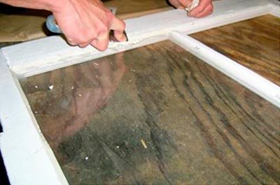 Ако сте педант и сте настроени за сериозна работа, тогава на теория стъклото трябва да се отстрани от рамката и след внимателно смазване да ги поставите на място. В случай, че нямате шпакловка под ръка, можете да използвате маслена боя, която също перфектно затваря пукнатините.