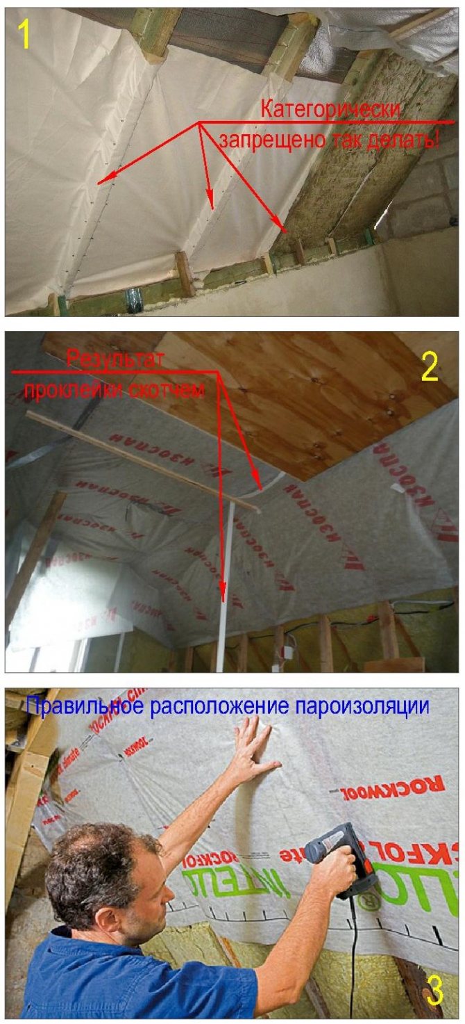 Важно е не само да се постави правилно пароизолацията, но също така да се осигури вентилационна междина между слоя на бариерната бариера и облицовката на конструкцията за довършителни работи, за която контра-летвите се пълнят по щайгата. Отлагането на влага върху грапавата страна на положените пароизолационни листове естествено ще се изпари, без да повреди финала. Ако пароизолацията е инсталирана правилно, изолацията е надеждно защитена от влага. Почти половината от проблемите, свързани със замръзването и повреждането на конструкциите, са свързани с недостатъци при монтажа на пароизолацията.