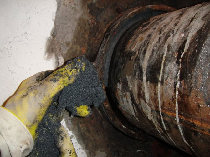 Съвет! Преди изливане на течни уплътнителни съединения (циментова замазка, разтопена сяра, мастика), влакнести материали се навиват върху тръбите - санитарен теглич, юта, лен.