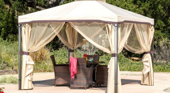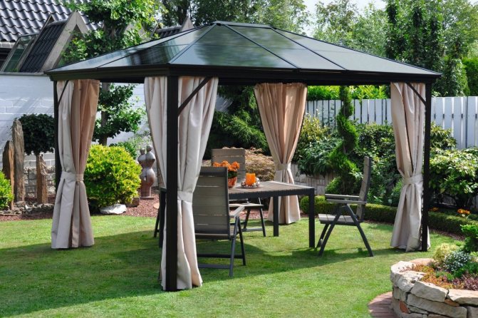 Основното предимство на беседка на фундамент е наличието на под. Добре е също така, че вътрешната повърхност на павилиона е на кота, макар и не висока, и не позволява пръски пръст да влизат в стаята по време на лошо време.