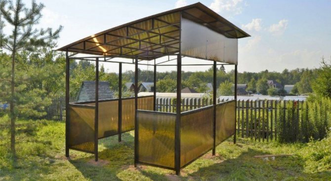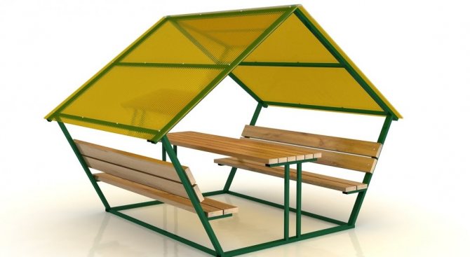 Можете да изградите беседка само от два материала: метален профил и клетъчен поликарбонат или ондулин за покрива. Допълнителна декоративност може да се постигне, като се вземат за основа тръби с различни секции.