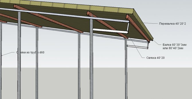 Когато заварявате и инсталирате навес близо до една от стените на сградата, е по-добре да направите дължината и ширината на носещата конструкция малко по-къси. Такава операция ще позволи освобождаването на покриващия материал и оттичането на дъждовната вода в улуците. Друго предимство на метода е спестяването на повече от 2 м профилни тръби във всяка ферма.