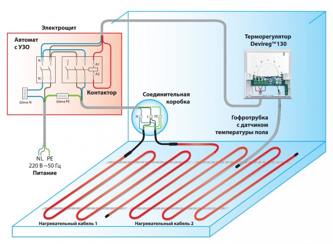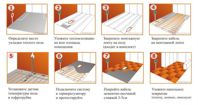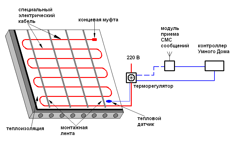В някои случаи тя може да бъде положена под мазилка или керамични плочки, или по протежение на стената. Схемата на пода на кабела се състои от температурен сензор, към който е свързан контролния блок. Кабелът и сензорът са свързани към монтиран на стената термостат. Когато се изпрати сигнал от сензора, термостатът включва или изключва отоплителния кръг от мрежата.