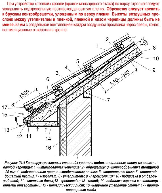 Има версия на комбинирания (мансарден) покрив, при която като подпокривен филм се използва пароизолирана хидро или бариера срещу пара. Но в този случай е необходимо да се осигури ефективна вентилация на пространството както над, така и под филма, общата височина на вентилационните пролуки ще достигне 10 см. Това решение е ефективно, но усложнява дизайна и рядко се използва. Моля, обърнете внимание, че подложката (4), по-близо до надвеса, се извежда над стоманената престилка (15) и тя в улука на улучната система. Това винаги трябва да се прави, за да се гарантира, че кондензатът изтича от покривната конструкция.