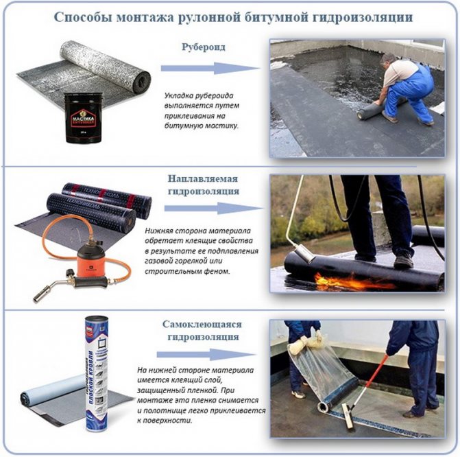 - Покривен материал, пергамент... Материалът, чието инсталиране се извършва от вида на залепването му към защитената повърхност. Монтажът върху скатен покрив е труден поради необходимостта от използване на горещ битум и неудобно разположение на повърхността.