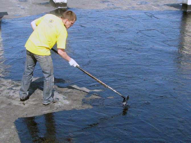 - Битумни мастики (заварена хидроизолация). Материалът е удобен за стари конструкции, тъй като не изисква цялостно почистване на повърхността. Работи добре върху ръжда, влажни или прашни основи. Почистването е необходимо само ако има дебел слой мръсотия, пръст, лед и т.н. Ако процесът на нанасяне на покритие се извършва няколко пъти подред, може да се постигне доста дебел слой. Недостатъците включват взискателност на някои видове температура на приложение, достигаща 160 °, освен това, нанасянето на плътна мастика физически не винаги е удобно при скатен покрив. Също така, битумната мастика е подходяща за хидроизолация на шисти или покривни фуги на ондулин.