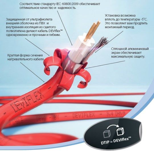 Нагревателният кабел е медна жица, която пренася електрически ток. За да се увеличи производителността, той се поставя в специална намотка от влакна и топлоустойчив поливинилетилен. Благодарение на този дизайн се гарантира и безопасността на използването му. Електрическият ток, преминавайки през проводника, освобождава топлинна енергия, поради което повърхността се нагрява.