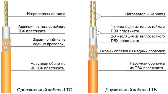 - Кабелът в рогозките може да бъде едно- и двужилен. Двужилните модели се използват за отопление на помещения, в които хората са постоянно, тъй като те имат ниско ниво на електромагнитно излъчване.