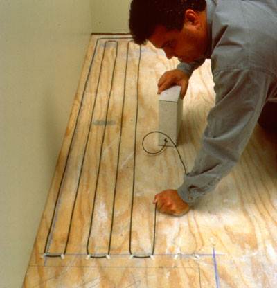 Снимките на полагане на електрическо подово отопление със собствените си ръце са отразени в нашата статия и ще служат като помощ при извършване на работа. Разликата между полагането на топъл електрически под под плочка и под ламинат е, че плочките могат да бъдат монтирани на минимална замазка директно върху нагревателните кабели, като в същото време се препоръчва да се направи слой замазка между кабела и покритието от най-малко 20 mm под ламината, за да се гарантира, че ламинатът не се деформира.