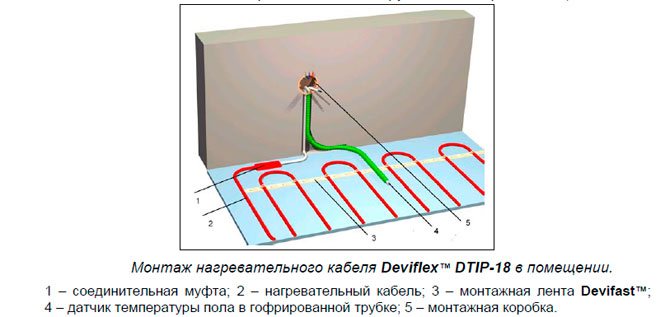 В някои случаи тя може да бъде положена под мазилка или керамични плочки, или по протежение на стената. Схемата на пода на кабела се състои от температурен сензор, към който е свързан контролния блок.Кабелът и сензорът са свързани към монтиран на стената термостат. Когато се изпрати сигнал от сензора, термостатът включва или изключва отоплителния кръг от мрежата.