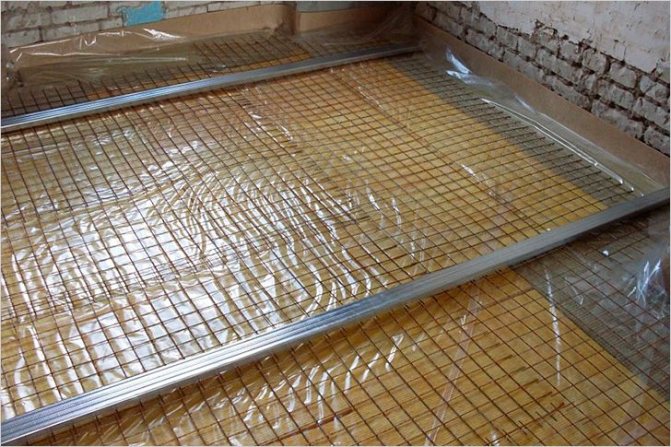 Преди да инсталирате топлоизолацията, основата е покрита с хидроизолационен филм. Той предотвратява образуването на конденз в точките на контакт между долната част на конструкцията за подово отопление и студената основа.
