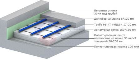 Нагревателният му елемент са тръби с гореща вода в тях. За да се създаде подобен самонивелиращ се под на топъл под, тези елементи просто се изсипват с бетон или върху тях се прави настилка. Но в този случай ще трябва да инсталирате и специални водачи.