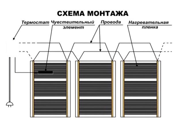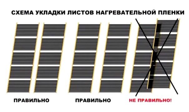 Филмът се разстила с медни нагреватели надолу, на разстояние 10 - 20 см от стените и метър от източници на топлина, например батерии. Филмът се нарязва на светли места, между тъмните области, поставя се от край до край без припокриване и също се закрепва заедно с лепяща лента.