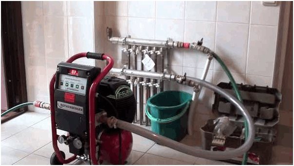 Важно! За проверка (налягане) на водната верига с въздух се използва компресор, който впръсква въздух в тръбопровода при налягане до 5 бара, не повече. В противен случай целостта на системата в точките на свързване може да бъде нарушена.