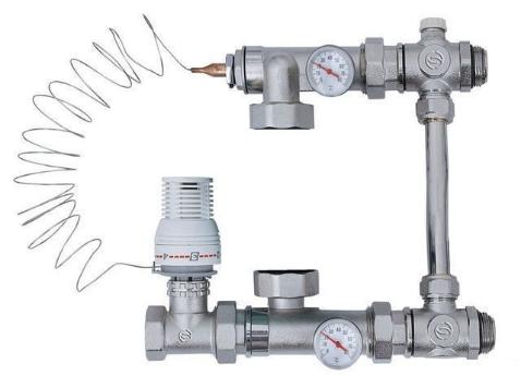Веригата, използваща трипътен клапан, е доста проста. Изходите на клапаните са свързани към линията за подаване на топла вода и тръбопровода с охладената течност, третият изход отива към захранващия колектор на топъл под на колектора. Помпата е инсталирана след трипътния клапан, докато е важно помпата да изпомпва охлаждащата течност към захранващия колектор. След помпата е монтиран температурен датчик, свързан към регулатора на течността (сектор) в самия трипътен клапан.