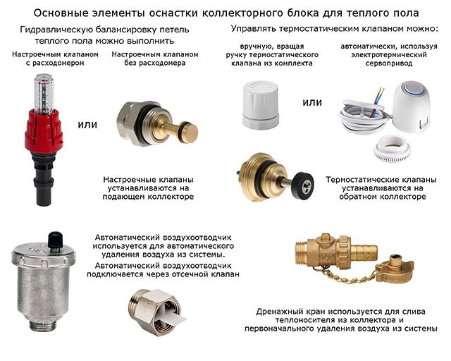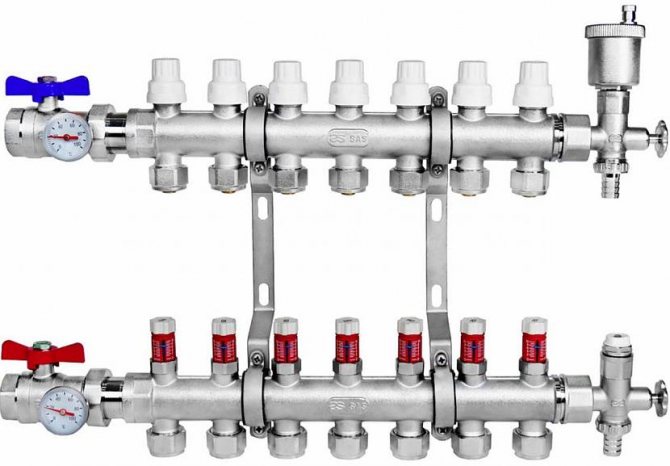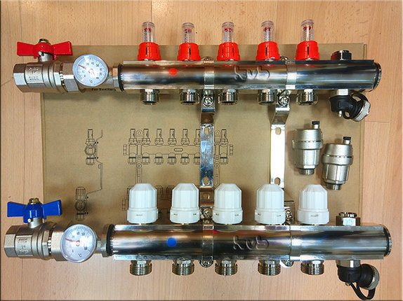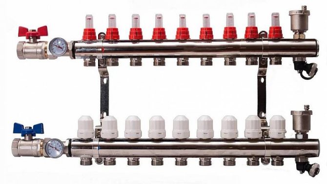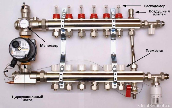 - Разпределителен гребен. Уред, оборудван с няколко изхода за охлаждащата течност, към които са свързани различни вериги на системата за подово отопление на колектора. На всяка верига е инсталиран разходомер, който дава възможност за регулиране на температурата на течността със специални клапани - ръчно или с помощта на автоматични серво задвижвания.