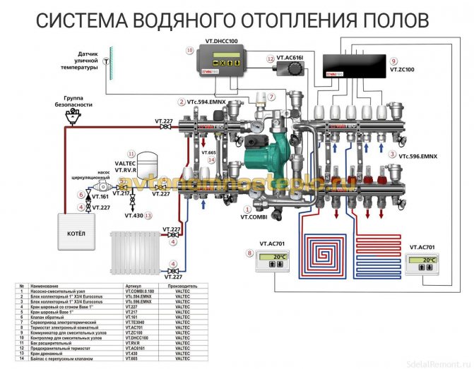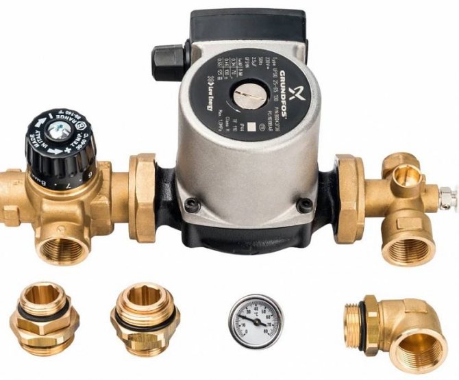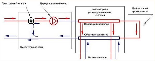 Работата на контролирана система най-често се основава на използването на двупосочен и трипътен клапан. Ако в допълнение към подовото отопление в схемата има и отоплителни радиатори, тогава определено е необходима циркулационна помпа, тъй като помпата, с която е оборудван отоплителният котел, очевидно няма да е достатъчна, за да осигури пълен поток на охлаждащата течност в отоплителна система. Обикновено помпата, вградена в котела, служи за изпомпване на охлаждащата течност през радиаторната система, а втората помпа е инсталирана на топъл под. Цялата конструкция се нарича помпа и смесител.
