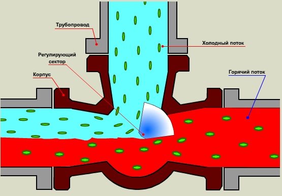 - От котела се подава горещ топлоносител. В този случай клапанът напълно преминава тази течност, без да добавя студен топлоносител.