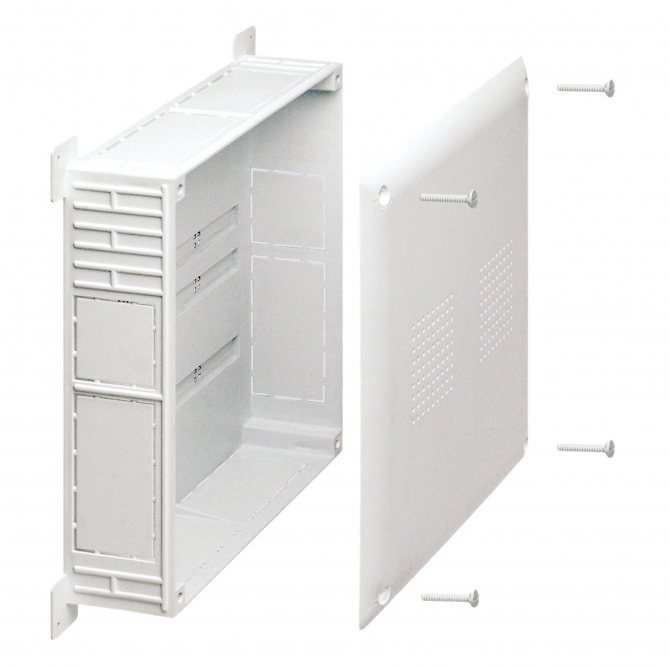 - Разпределителна конструкция се вмъква във вдлъбнатината на стената, свързана с анкери отстрани на шкафа.