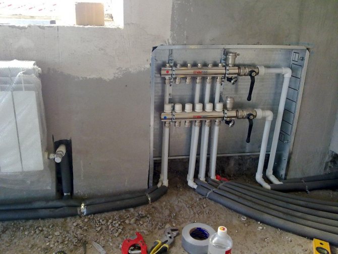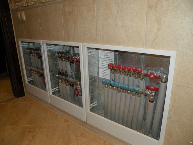 В сравнение с „направи си сам“ тръбопроводите, колекторното окабеляване е много по-ефективно и практично и изглежда много естетически приятно в специален шкаф. Шкафът за колектор за отопление може да побере както метър, така и електрическо оборудване.