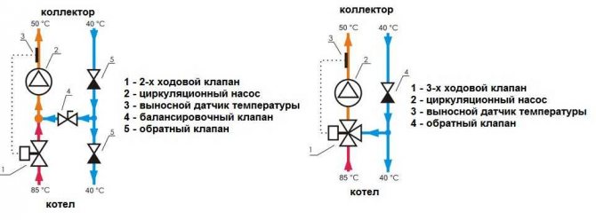 В тази схема примесът на студен топлоносител се появява постоянно, поради което навлизането на прегрята течност от котела в контурите на топъл под е фундаментално невъзможно. Двупосочната верига на клапана се счита за по-стабилна и надеждна.