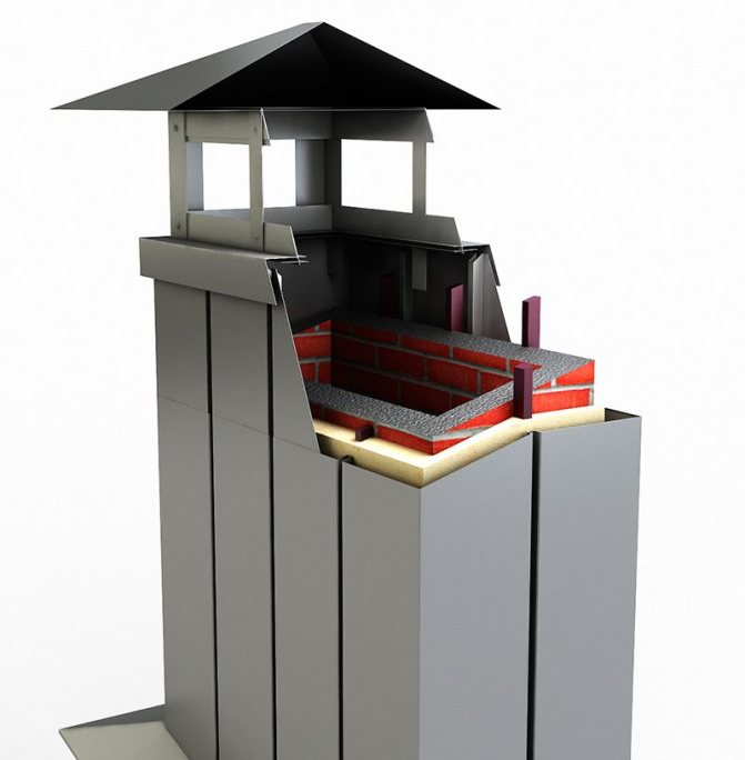Освен това се монтират междинни елементи и горната част на конструкцията, които са свързани помежду си с помощта на скоби. За уплътняване на фугите се използват съединения на основата на каучук или силикон. Особено внимание трябва да се обърне на изолацията на ставите на главата и комина.