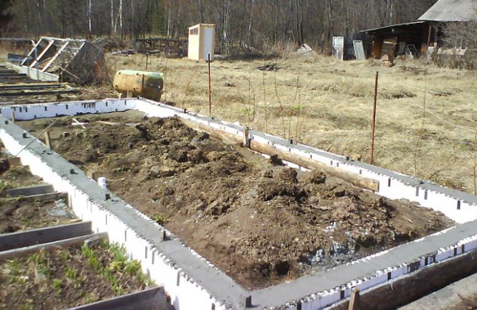 Обикновено размерите на изкопа за кофраж от пяна се изрязват с 10-15 см по-широко от готовия блок. Това позволява да се монтират чифт дистанционни разпенени плоскости с минимален обем на мазето. След сглобяването на цялата конструкция синусите се покриват с постна глина и пясък с леко уплътняване с ръчно набиване.