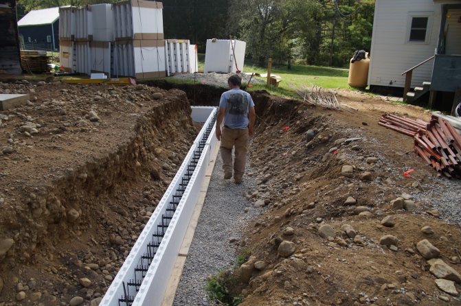 Технологията за стенни сглобяеми блокови кутии не е подходяща за използване при изграждане на фундамент. След полагане на 4-5 реда блокове, кофражът на стената се излива с бетонен хоросан, получава се бетонов "скелет", проникнат с елементи от пяна. В този случай ажурната бетонна конструкция на стената, покрита с експандиран полистирол, е твърде слаба, за да издържи теглото на сградата от 100 тона. Фундаментът остава основата, той трябва да бъде здрав и твърд, следователно, независимо дали се използва кофраж от дърво или пяна, структурата на фундаментната система трябва да бъде монолитна и тежка.